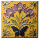 A square tile with a yellow background, featuring a raised floral design with three large flowers with purple petals and yellow centres, green stems, and green leaves. A black butterfly is positioned at the bottom centre of the tile. Additional floral elements are placed in the corners.