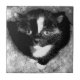 This cute kitten walked into my husband’s stables and ended up staying there. I’ve digitally altered the image to look like a close-up, black-and-white portrait of a tuxedo kitten, captured in a moment of quiet curiosity. The kitten's large, reflective eyes gaze intently, drawing focus amid the stark contrast between its dark fur and white markings. Soft textures surround the kitten, enhancing the feeling of warmth and solitude, while the monochromatic palette adds a layer of artistic mystery to the composition.
