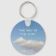 The sky is the limit keychain with slogan. Blue sky White clouds background.