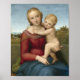 The Small Cowper Madonna (c. 1505) by Raphael is a Renaissance masterpiece that depicts the Virgin Mary tenderly holding the Christ Child in a serene landscape. The painting exemplifies Raphael’s signature style, chraacterised by soft modelling, harmonious composition, and delicate colour transitions. Mary, dressed in a red gown with a blue mantle, gazes gently at the viewer while the infant Jesus sits comfortably on her lap, symbolising maternal love and divine grace. The tranquil countryside in the background enhances the painting’s sense of peace and natural beauty, reflecting the influence of Leonardo da Vinci and Raphael’s deep devotion to religious themes.