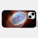 The Southern Ring Nebula in near-infrared light, captured from the James Webb Space Telescope. This scene was created by a white dwarf star - the remains of a star like our Sun after it shed its outer layers and stopped burning fuel though nuclear fusion. Those outer layers now form the ejected shells all along this view. In this Near-Infrared Camera (NIRCam) image, the white dwarf appears to the lower left of the bright, central star, partially hidden by a diffraction spike. The same star appears - but brighter, larger, and redder - in the Mid-Infrared Instrument (MIRI) image. This white dwarf star is cloaked in thick layers of dust, which make it appear larger. Over thousands of years and before it became a white dwarf, the star periodically ejected mass - the visible shells of material. As if on repeat, it contracted, heated up - and then, unable to push out more material, pulsated. Stellar material was sent in all directions, and provided the ingredients for this asymmetrical landscape. Today, the white dwarf is heating up the gas in the inner regions - which appear blue at left and red at right. Both stars are lighting up the outer regions, shown in orange and blue, respectively. Peer at the circular region at the centre and you'll see a wobbly, asymmetrical belt of material. This is where two bowls that make up the nebula meet. (In this view, the nebula is at a 40-degree angle.)