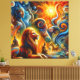 The artwork depicts a powerful and mystical scene, blending elements of spirituality, mythology, and nature. The central figure exudes a sense of serenity and strength, while the surrounding animals add to the overall aura of power and mystique. Central Figure The central figure appears to be a goddess or deity, adorned with intricate golden jewellery and a serene expression. Her half-shaded face could symbolise duality or a connection between different realms. Her gentle interaction with the tiger cub suggests compassion and harmony with
