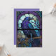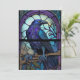 Depicted in stained glass, a spooky, creepy raven turns his gaze on the viewer.