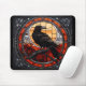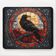 Depicted in stained glass, a spooky, creepy raven turns his gaze on the viewer.