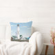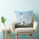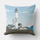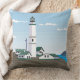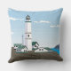This drawing features a white, green and black lighthouse overlooking the sea. The sky is blue with a few clouds. White houses with green roofs surround the lighthouse. The back of the pillow is the same as the front. This design is available on assorted styles and sizes.