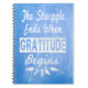 Distressed blue gratitude journal that states in white lettering, "the struggle ends when gratitude begins"