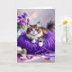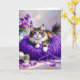 A Happy Birthday card for any cat lover. A sweet kitty cat sitting on a ball of purple yarn and next to a purple vase of flowers. Inside is a sweet poem for a friend or family member full of cute cat puns.
