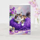 A card to let your friend or family member know you are thinking about them, cute for any cat lover. A sweet kitty cat sitting on a ball of purple yarn and next to a purple vase of flowers. Inside is a sweet poem for a friend or family member full of cute cat puns.