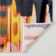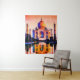 Tapestry in an illustration of the Taj Mahal, reflected in the water, and backed by a deep coral orange sunset sky
