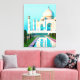 Canvas in an illustration of the Taj Mahal, reflected in a pool, under an aquamarine blue dawn sky