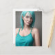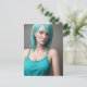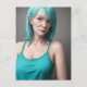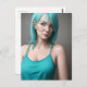 A woman with teal hair wearing a spaghetti strap tank top in the same colour as her hair