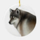 Original fine art design of a regal Timber Wolf by artist Carolyn McFann of Two Purring Cats Studio on a quality holiday ornament for wildlife fans.