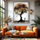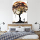 An imposing tree, its intertwined roots like ancient memories, guards secrets among the golden and reddish leaves. A human silhouette observes, while birds fly freely, uniting nature and soul in a poetic embrace. Each watercolor brushstroke is a sigh of peace, reminding us that life grows in roots and dreams.