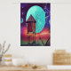 A small building in a village with a large spiderweb and a blue moon in the background. A colourful unique painting. This is a AI generated art piece,