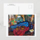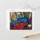 A fine art postcard with the painting by the French artist Suzanne Valadon (1865-1938), The Violin Case (1923). She was the first woman painter admitted to the Société Nationale des Beaux-Arts. A portrait of a fine violin in a blue velvet case on a table with a clay pot of tulips.