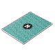 This fun volleyball themed notebook for girls features the text, "The volleyball court is my happy place" in a casual handwritten-style font along with heart shapes in black patterned diagonally on a light teal background - personalize with her name and monogram or varsity letter on large circle pendant - background, circle pendant, and personalized text color can be changed to ANY color that contrasts with the black text pattern - katz_d_zynes