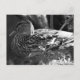 A black and white photograph of a duck sitting on a river bank looking out towards the water.