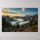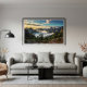 Majestic mountains rise beneath a golden and blue sky, wrapped in serene mist. A delicate geometric web overlays the scene, transforming it into a surreal dream where raw nature meets soft art. Vibrant colours, lush vegetation, and the contrast between realism and abstraction create a work that inspires peace and wonder—perfect for those seeking to connect with the magic of the natural world.