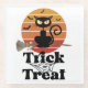 The design features a captivating image of a black cat with large, mesmerising eyes perched on a witch broomstick. The feline soars gracefully across a vibrant full moon, accompanied by a trail of bats in the background. Underneath the broomstick, the words "Trick or Treat" add a playful touch, while a central spider accentuates the spooky atmosphere.