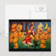 Surprise your friends with a funny vintage Halloween card featuring a witch dancing with pumpkin characters and her cat.
