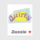 The word Quirky in a fun quirky retro font in purple on yellow and blue geometric shapes.