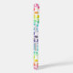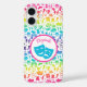 iPhone case with cheery rainbow coloured pattern of theatre-related icons on white background, with aqua coloured drama masks in a circle where you can add a name, date, initials, etc. to personalise this case for your favourite theatre-lover. Some of the icons include: Shakespeare, drama masks, microphone, music notes, director's chair, tickets, stars, stage curtains, spotlight, roses, and more.