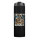 Therapy is good for some folks but for you, not so much. You just need to spend more time in your garage. This design shows a man doing woodwork in his garage with bold colours and fonts.