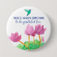 An inspirational button pin featuring "There's always something to be grateful for" with mauve pink cyclamen flowers and a turquoise hummingbird illustrated with watercolor. You can edit the text to fit your needs. In the Language of flowers Cyclamens symbolize timid home and sincere affection.