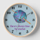 A clock with the text, There's always time for crochet. It has a blue background, decorated with a ball of turquoise and pink yarn, with an elegant wooden crochet hook through it. Ideal for anyone who loves crochet, yarn crafts, crafting or creating.