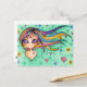 A post card featuring a coloured pencil traditional illustration of a girl with large purple eyes floating on a teal green background. Her lovely long hair flows to the right and is made up of blue, pink, purple and yellow strands making it seem like a rainbow. Around her there are stars and hearts scattered.