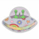 In this fun sci-fi illustration by Richard H. Fay, groovy green aliens ride in a flying saucer decorated with flowers, hearts, a star, and a rainbow.