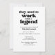 Say goodbye in style with this funny and heartfelt retirement invitation. The front features the bold quote “They used to work with a legend” along with the retiree’s name and party details—because coworkers deserve some recognition too. On the back, space to share a memory by the invited legends. They can write a memory and take it to the party. Making it a personalised keepsake they’ll truly appreciate. It’s a perfect farewell from the retiree to those who made workdays more enjoyable (or at least more bearable).