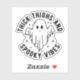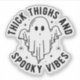 This fun and spooky Halloween design features the phrase "Thick Thighs and Spooky Vibes" arranged in a circular layout around a cute, classic ghost illustration. The ghost, with its simple yet expressive eyes, is the central focus of the design, giving it a playful and whimsical vibe. Hanging from the ghost's hands are two small spiders, adding a touch of creepiness to the otherwise light-hearted design. The text is bold and clean, creating a strong visual impact while maintaining a playful tone. The black and white colour scheme gives the design a timeless and versatile look, making it perfect for Halloween.
