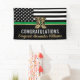 This retirement design features a military flag with black and white stripes, and a thin green line stripe as well. The gold army boots sits above the name of the retiring sergeant, captain, soldier, lieutenant or general.
