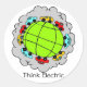 Globe with street lines and colourful cars driving around the circumference and smog all over. The words read "Think Electric" to get people thinking about electric cars.