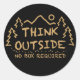 This design says "Think Outside, No Box Required" with a mountain range and trees in the background. A fun design for the outdoor lover!
