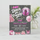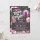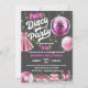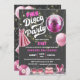 © Socialite Designs Inc. & LICENSORS. Celebrate a disco birthday party by inviting the guests with this fun, pink disco birthday party invitation. Colours are pink, white, and grey. The design incorporates a fuchsia pink disco ball and gold / white string lights as a background. Design elements also include a pink glitter dress, pink rhinestone shoes, a pink purse, a pink record and pink balloon. Customise this fun invitation for your special celebration.