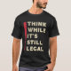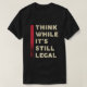 White text design with humourous message "Think While It's Still Legal". Perfect for those who like to make a statement with their clothing choices.