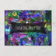 This vibrant, unique postcard is perfect for dropping a note to anyone you've been missing. The background was covered in a piece of digital artwork I did during a cheerful, chaotic design session. Hues of blue, green, purple, hot pink, yellow and turquoise fill the squiggles and lines and create a happy mess. It reminds some people of stained glass. Over that is a partially-opaque black horizontal badge overlaying the centre. The message, "Thinking About You!" is rendered in a modern, casual font. Both the message and the font can be changed to whatever you'd like it to say. Likewise, with the overlay and background separate, you might even choose to enlarge or re-position those elements too. Enjoy!