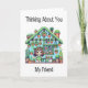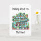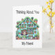 Cute ai art using an 8-bit pixel style girl in front of her house that is full of hanging plants. Cute card for a friend who is a plant lover.