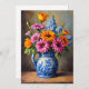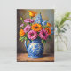 A beautiful blue and white pitcher filled with bright, colorful flowers is printed on a Thinking of You card. Text can be changed or deleted. Image AI-generated by IveyCottage.