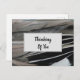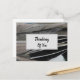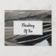 A photo of duck feathers adorns this "thinking of you" postcard creating horizontal stripes of feathers. The grey and black bird feathers add a touch of nature and a unique abstract element to this inexpensive postcard. "Thinking of you" appears inside a light grey rectangle on the front with additional words of support on the back of this note. All text can easily be customised to suit your needs.