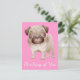 Aww...Who can resist the the sweet face of a Pug pup? This Postcard features a cute cartoon graphic of a brown and tan pug puppy dog highlighted against a pink background. This adorable little pup is ready to help you tell friends and family that your are thinking of them.