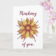"Thinking of you" greeting card with a golden yellow sunflower and scripted message surrounding the illustration. Perfect for dropping a hello to a friend or sending a note of sympathy. Blank on the inside.
