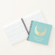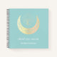 Chic and elegant notebook featuring a faux gold foil holographic illustration of a third eye over crescent moon decorated with leaves on a magical teal blue colour background.
