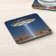 Under hard plastic glass. Square paper undercoasters. A flying saucer-shaped spacecraft hovering over a fenced military facility that is supposed to be zone 51 or area 51. A powerful ray of light descends from the center of the UFO towards the entrance of a restricted area, illuminating the starry night and the surrounding desert space.