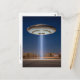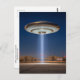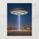 A flying saucer-shaped spacecraft hovering over a fenced military facility that is supposed to be zone 51 or area 51. A powerful ray of light descends from the center of the UFO towards the entrance of a restricted area, illuminating the starry night and the surrounding desert space.