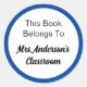 This Book Belongs To Teacher's Name Blue and White Classic Round Sticker