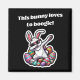 A digital illustration of a dancing, dabbing Easter bunny with a pile of Easter eggs.