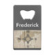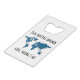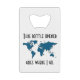 "This Bottle Opener" is printed in black above a flat world map and beneath the blue map are the words: Goes Where I Go. The flip side of this product displays the 'Name' that is of course, customisable. Beneath the name is a directional map with North, South, East, and West, indicated.